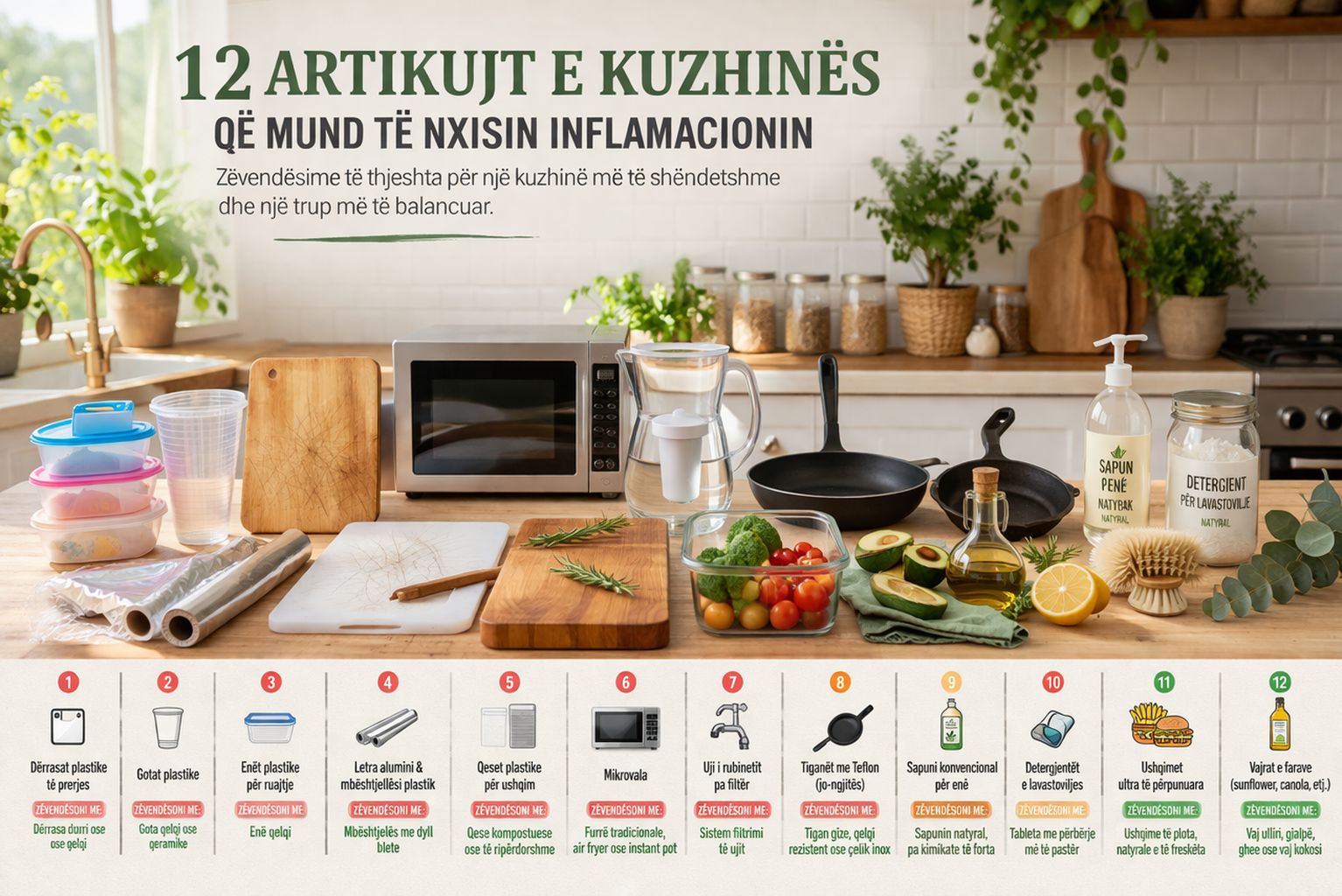 Në këtë artikull do të shohim pse është e rëndësishme të keni një kuzhinë të shëndetshme dhe cilët janë 12 artikujt që ia vlen të zëvendësoni për të mbrojtur trupin dhe mirëqenien tuaj.
